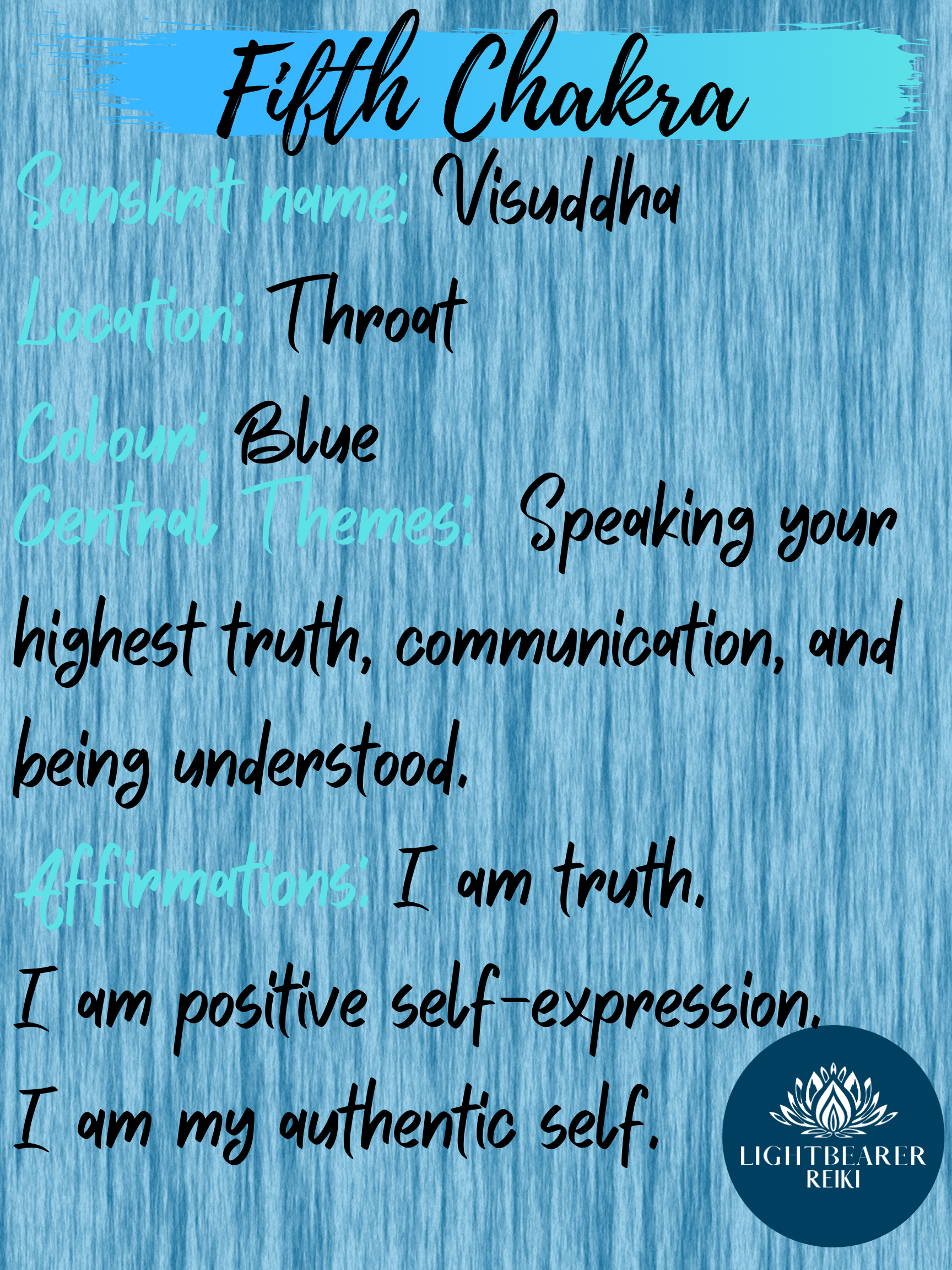 The fifth chairs is the throat chakra. This chakra is symbolized by the colour blue and is centred around speaking your truth, communicating clearly and effectively, and with feelings of being understood by others. Parts of the body associated with the fifth chakra are the throat, vocal chords, thyroid, esophagus, and the muscles of the neck.
